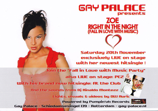 Saturday November 20th is the big day! i come in PEZ will perform his single 'At the Club' for the first time ever at club Gay Palace (Schiedamsesingel 139 - behind the Witte de With Straat - Rotterdam, The Netherlands)! Doors open at 11 PM (23.00 uur) and i come in PEZ will hit the stage at 1.30 AM (01.30 uur). Tickets cost 5,- euro before midnight and 10,- euro after midnight. The place will be packed so make sure you get there on time. See you saturday!
